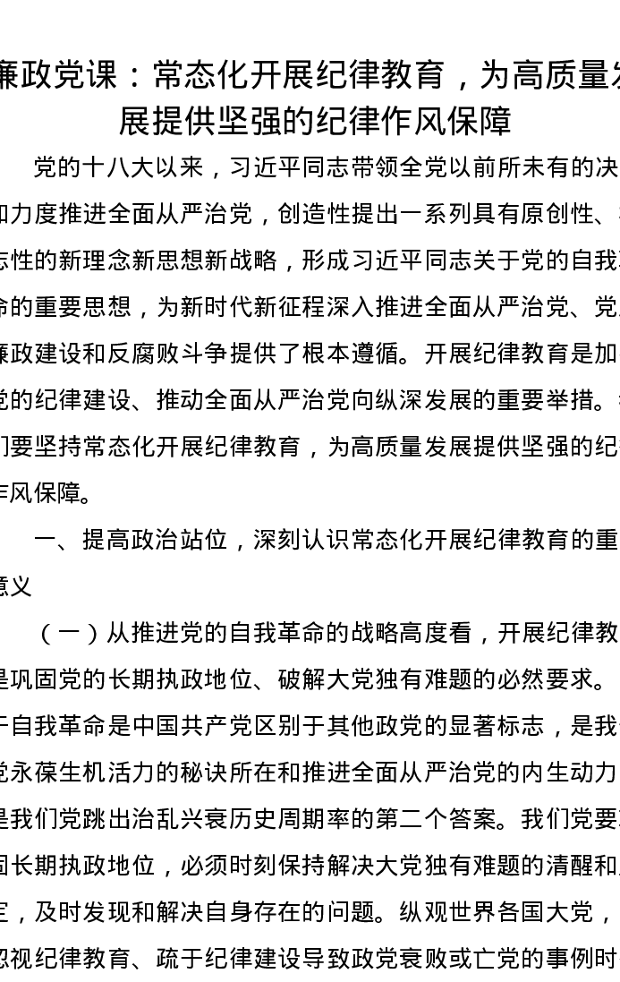 廉政党课讲稿:常态化开展纪律教育,为高质量发展提供坚强的纪律作风保障