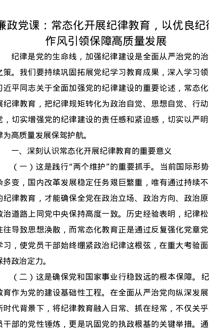 廉政党课讲稿:常态化开展纪律教育,以优良纪律作风引领保障高质量发展