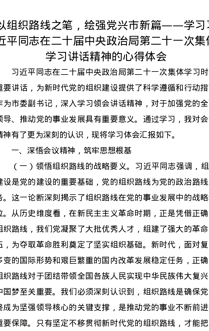 以组织路线之笔,绘强党兴市新篇——学习习近平总书记在二十届中央政治局第二十一次集体学习讲话精神的心得体会