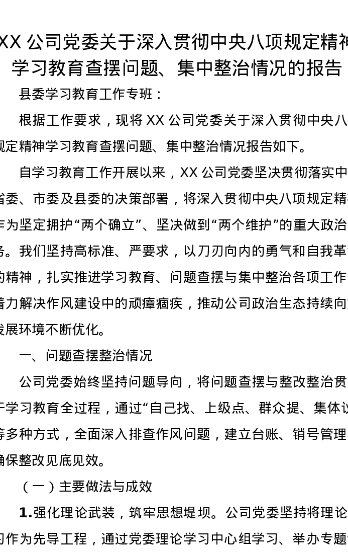XX公司党委学习教育查摆问题、集中整治情况的报告