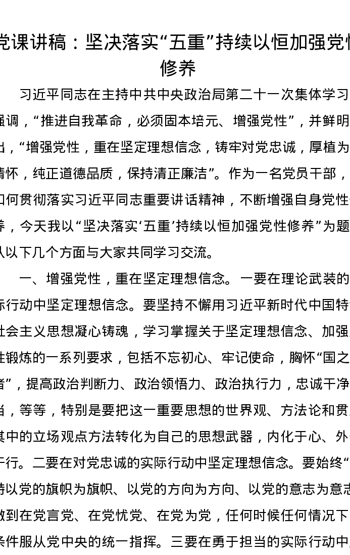 党课讲稿:坚决落实“五重” 持续以恒加强党性修养