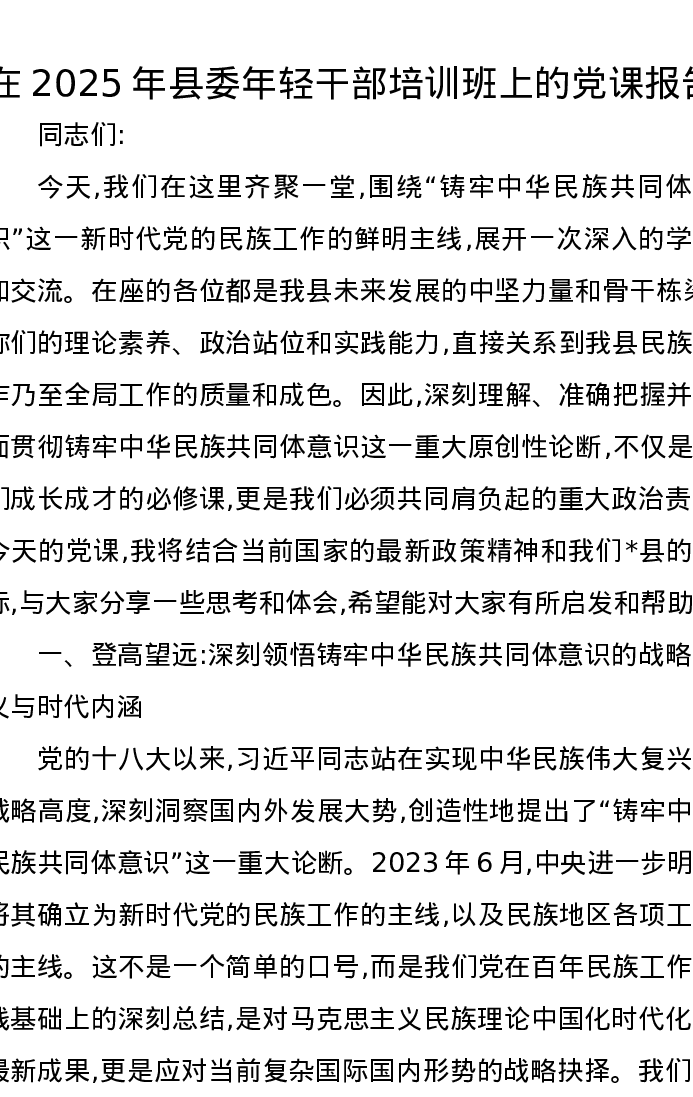 在2025年县委年轻干部培训班上的党课报告