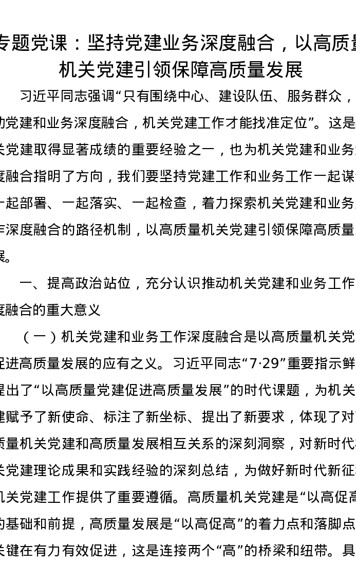 专题党课:坚持党建业务深度融合,以高质量机关党建引领保障高质量发展