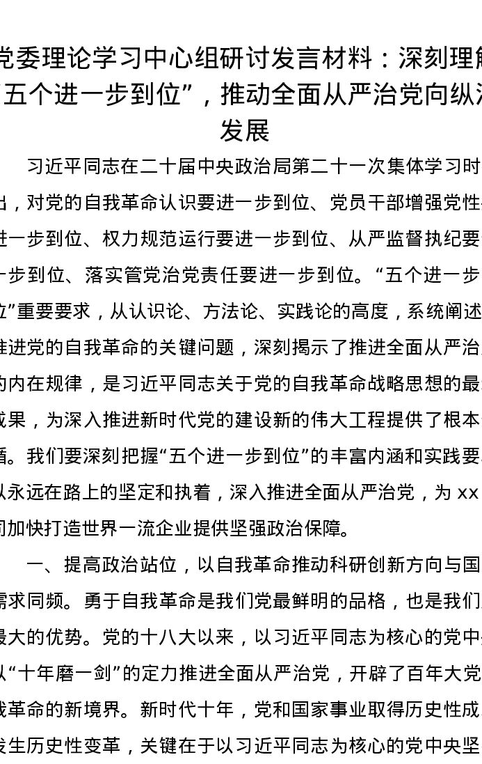 党委理论学习中心组研讨发言材料:深刻理解“五个进一步到位”,推动全面从严治党向纵深发展