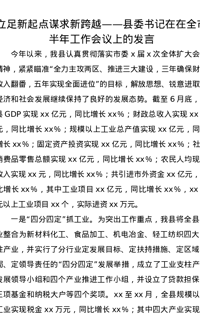 立足新起点谋求新跨越——县委书记在在全市半年工作会议上的发言