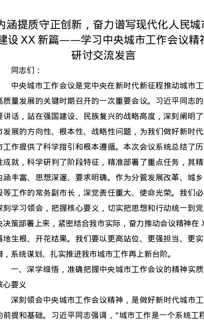 内涵提质守正创新,奋力谱写现代化人民城市建设XX新篇——学习中央城市工作会议精神研讨交流发言