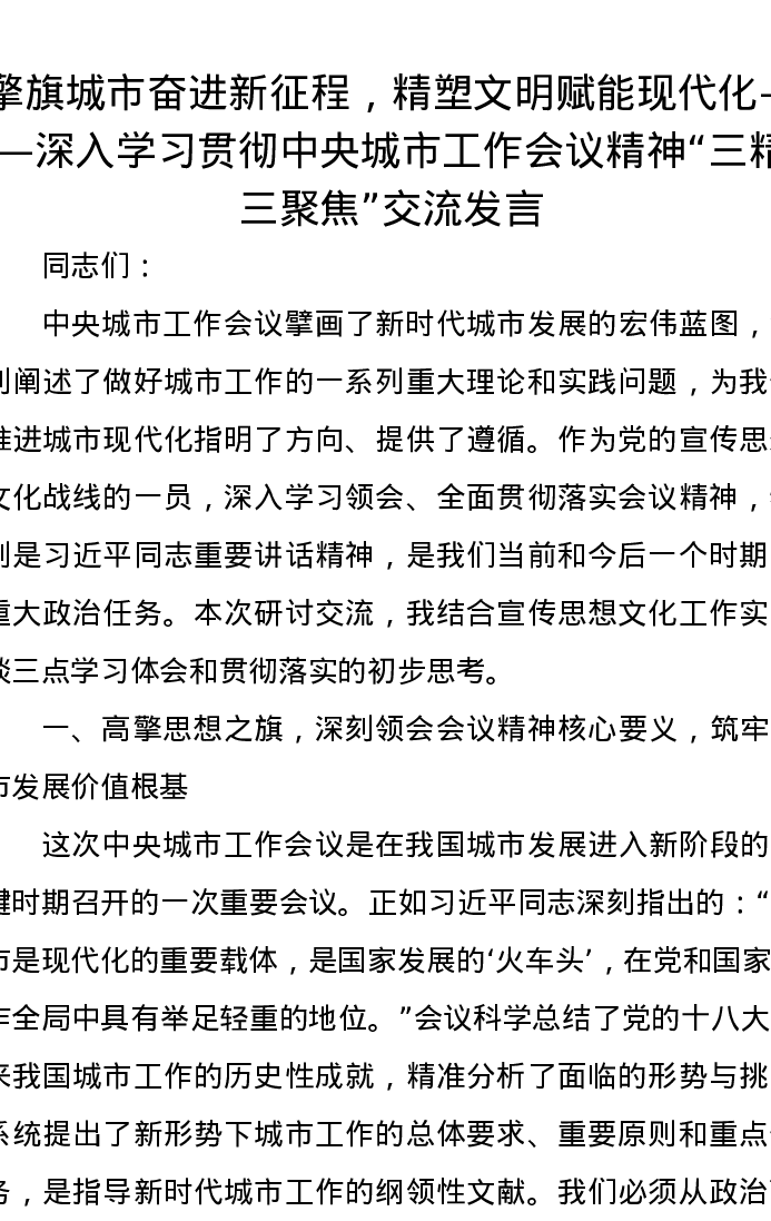 擎旗城市奋进新征程,精塑文明赋能现代化——深入学习贯彻中央城市工作会议精神“三精三聚焦”交流发言
