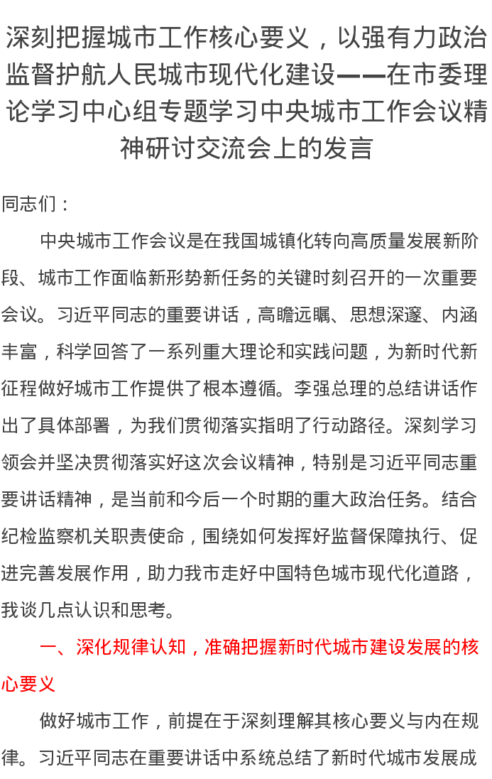 深刻把握城市工作核心要义,以强有力政治监督护航人民城市现代化建设——在市委理论学习中心组专题学习中央城市工作会议精神研讨交流会上的发言