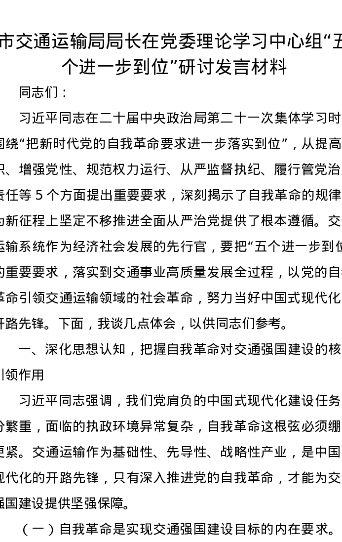 市交通运输局局长在党委理论学习中心组“五个进一步到位”研讨发言材料