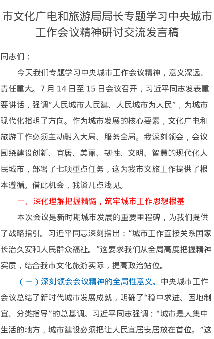 市文化广电和旅游局局长专题学习中央城市工作会议精神研讨交流发言稿