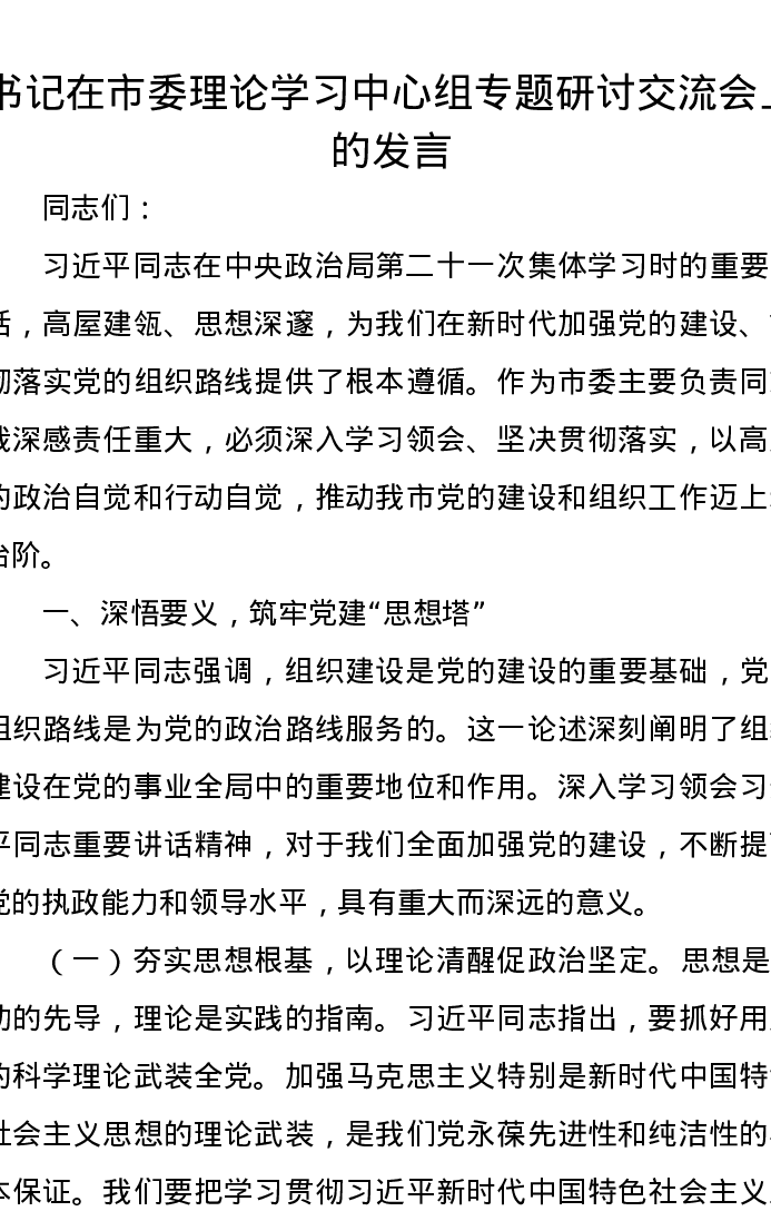 书记在市委理论学习中心组专题研讨交流会上的发言