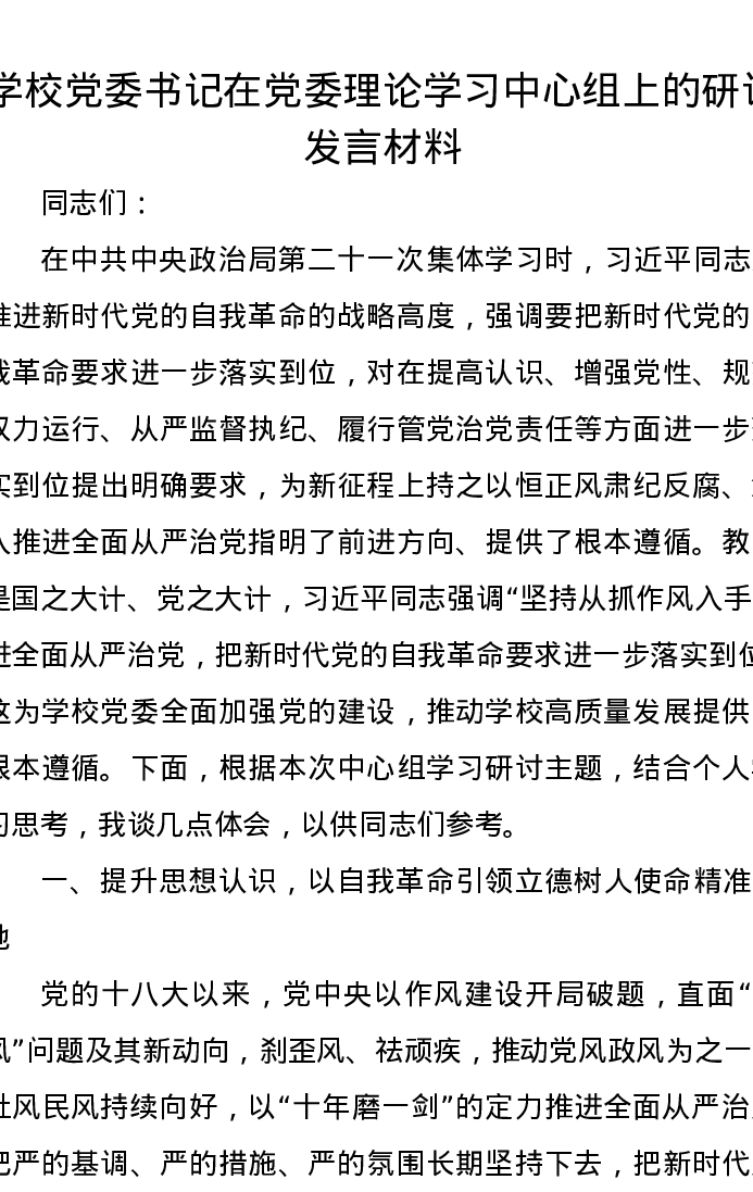 学校党委书记在党委理论学习中心组上的研讨发言材料