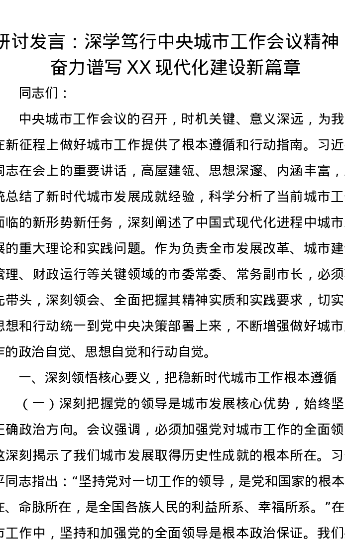 研讨发言:深学笃行中央城市工作会议精神,奋力谱写XX现代化建设新篇章