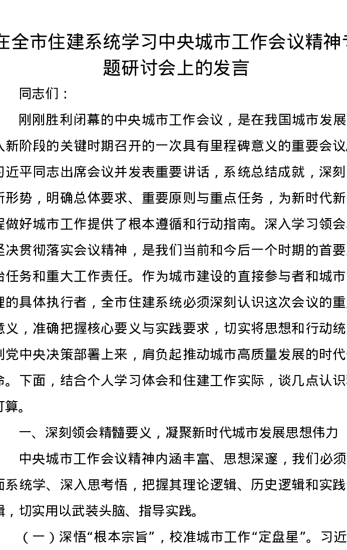 在全市住建系统学习中央城市工作会议精神专题研讨会上的发言
