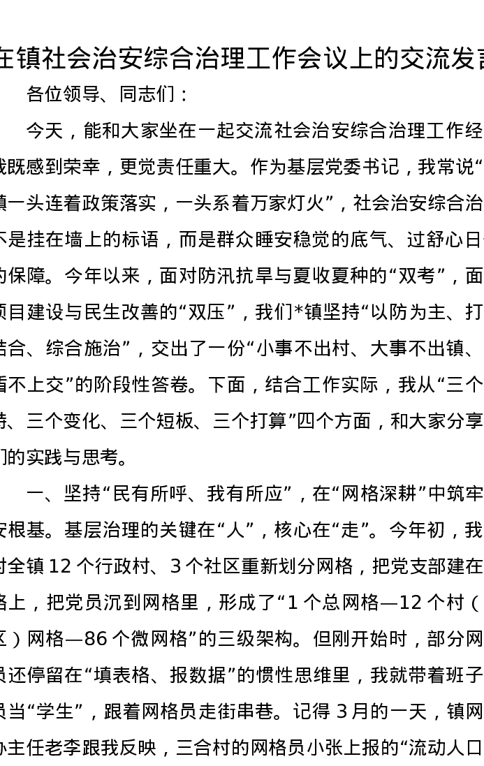 在镇社会治安综合治理工作会议上的交流发言