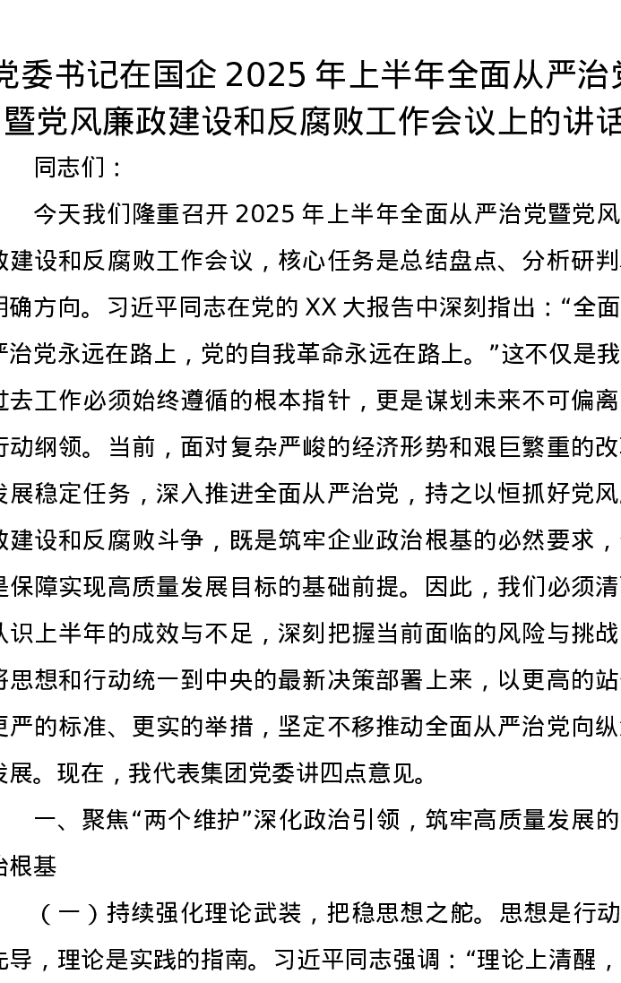 党委书记在国企2025年上半年全面从严治党暨党风廉政建设和反腐败工作会议上的讲话