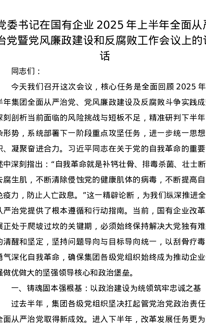 党委书记在国有企业2025年上半年全面从严治党暨党风廉政建设和反腐败工作会议上的讲话