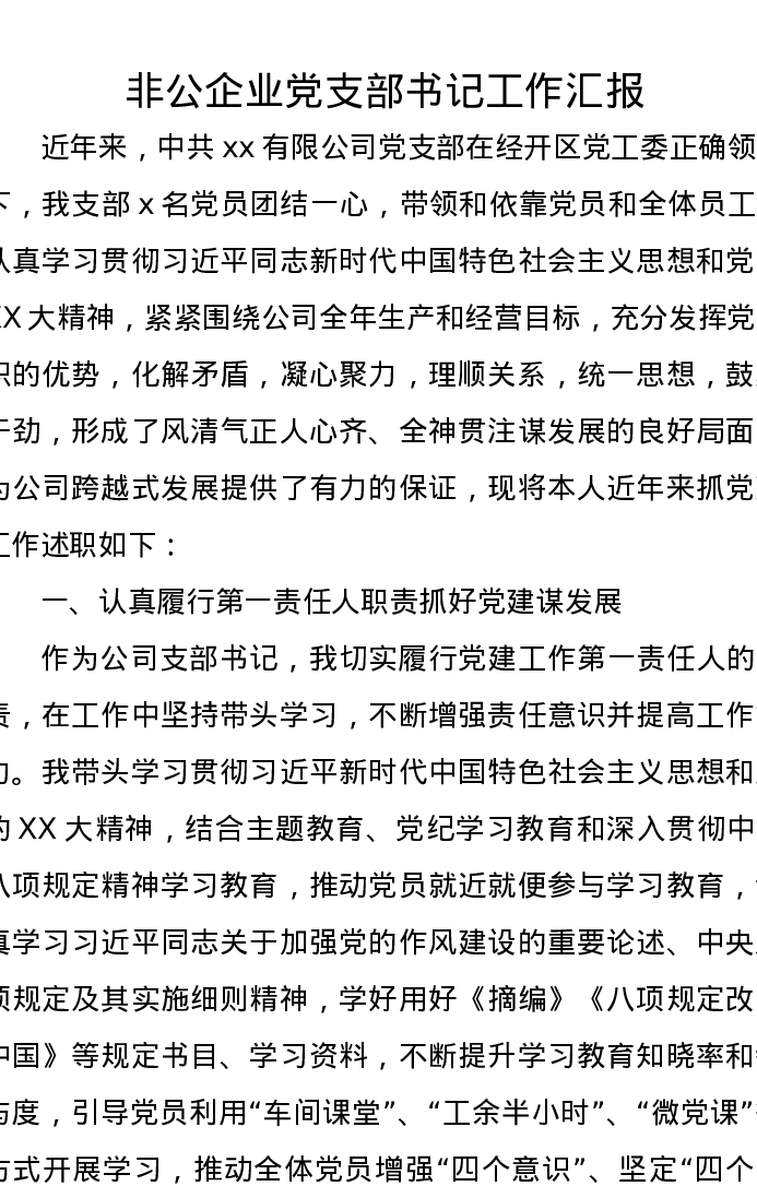 非公企业党支部书记工作汇报