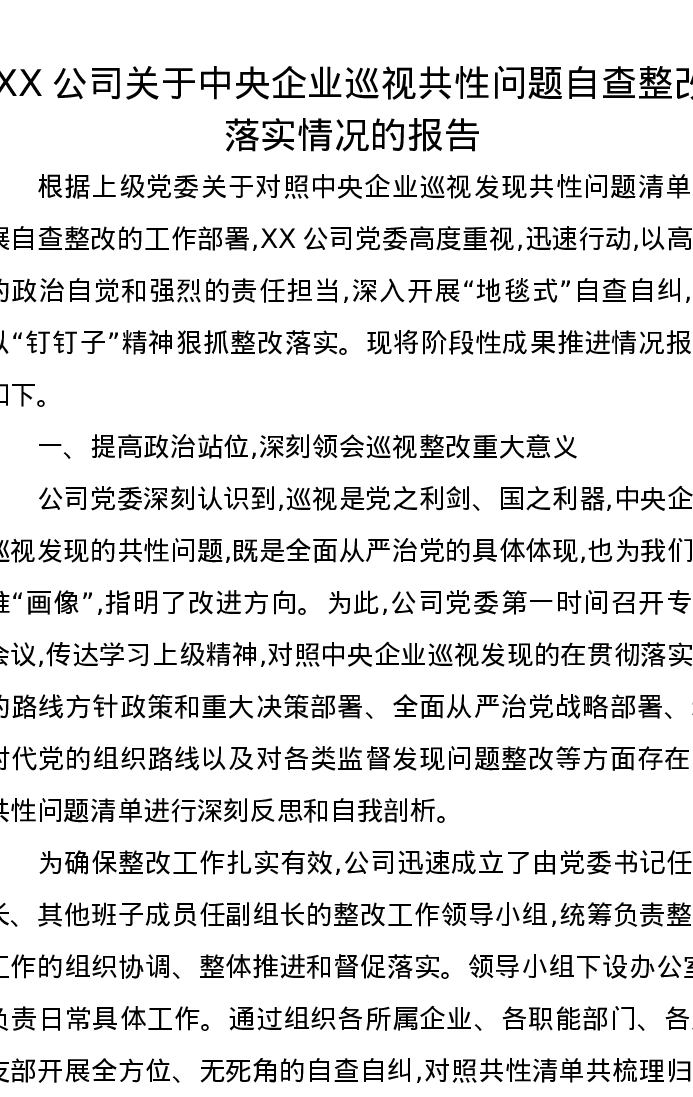 XX公司关于中央企业巡视共性问题自查整改落实情况的报告