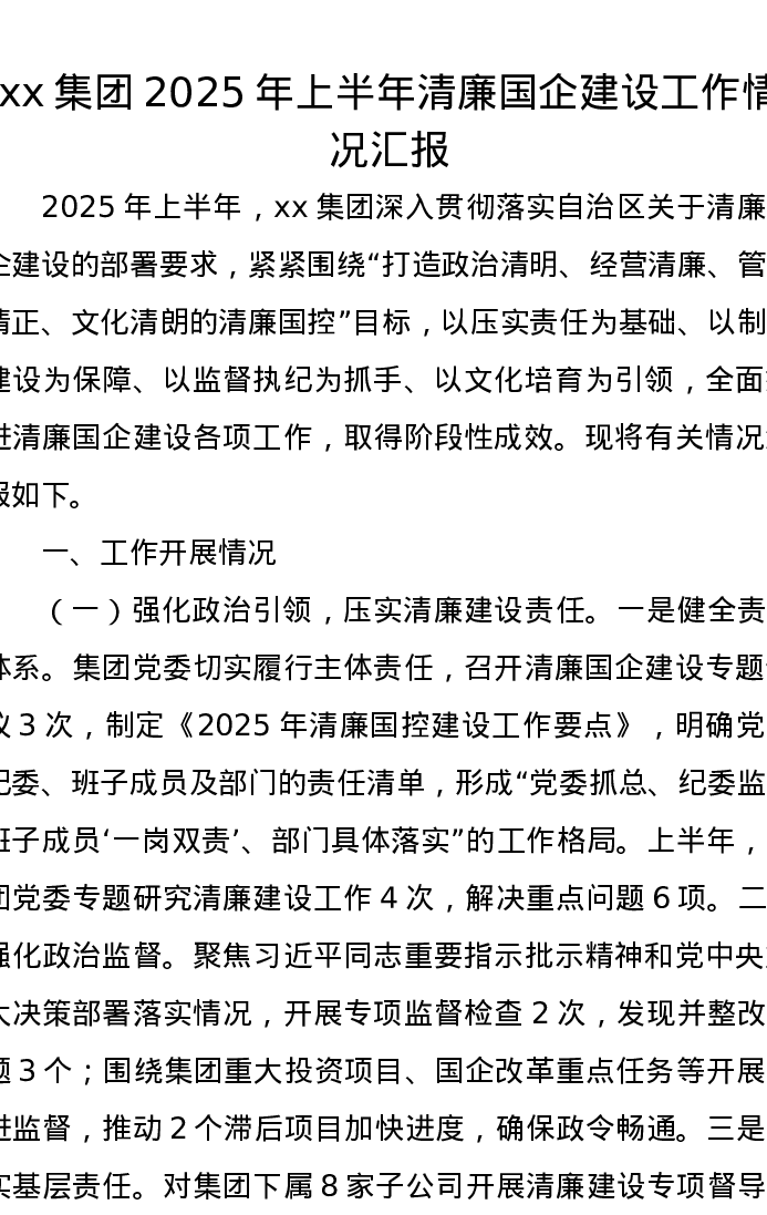 xx集团2025年上半年清廉国企建设工作情况汇报