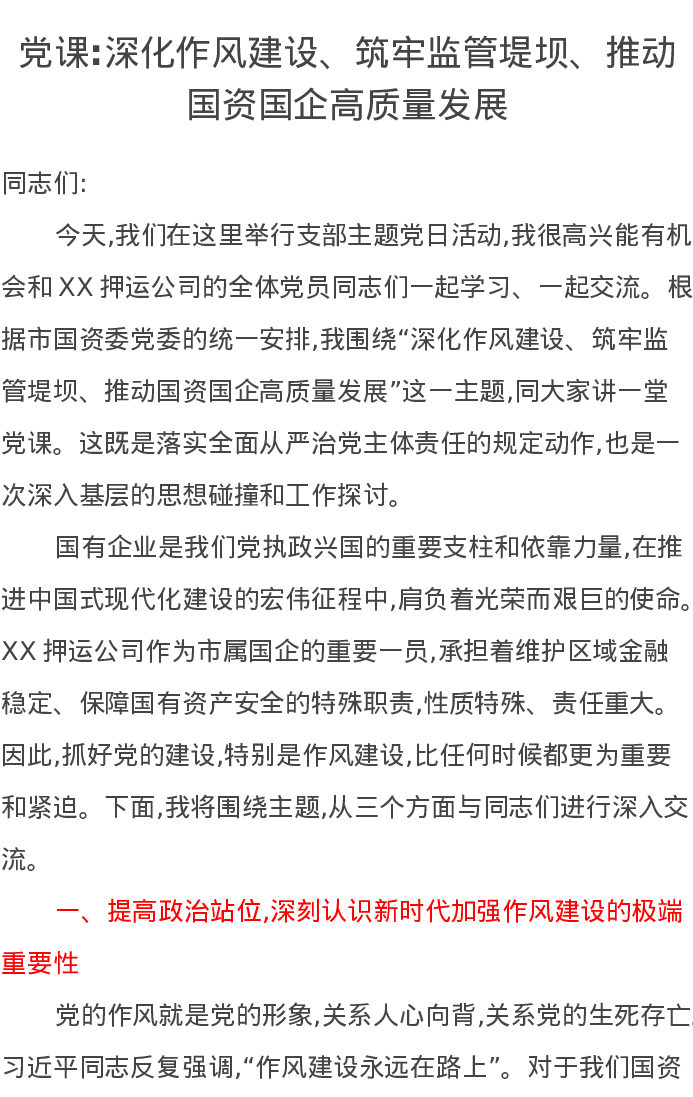 党课讲稿:深化作风建设、筑牢监管堤坝、推动国资国企高质量发展