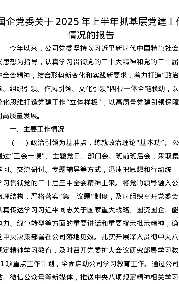 国企党委关于2025年上半年抓基层党建工作情况的报告