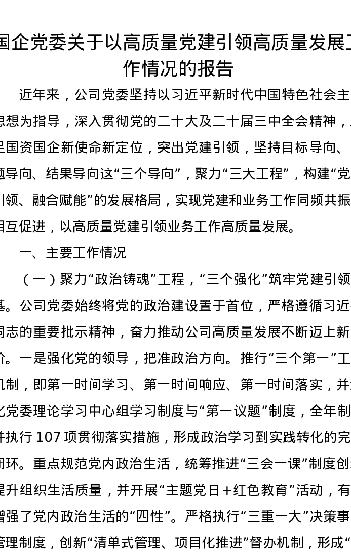国企党委关于以高质量党建引领高质量发展工作情况的报告