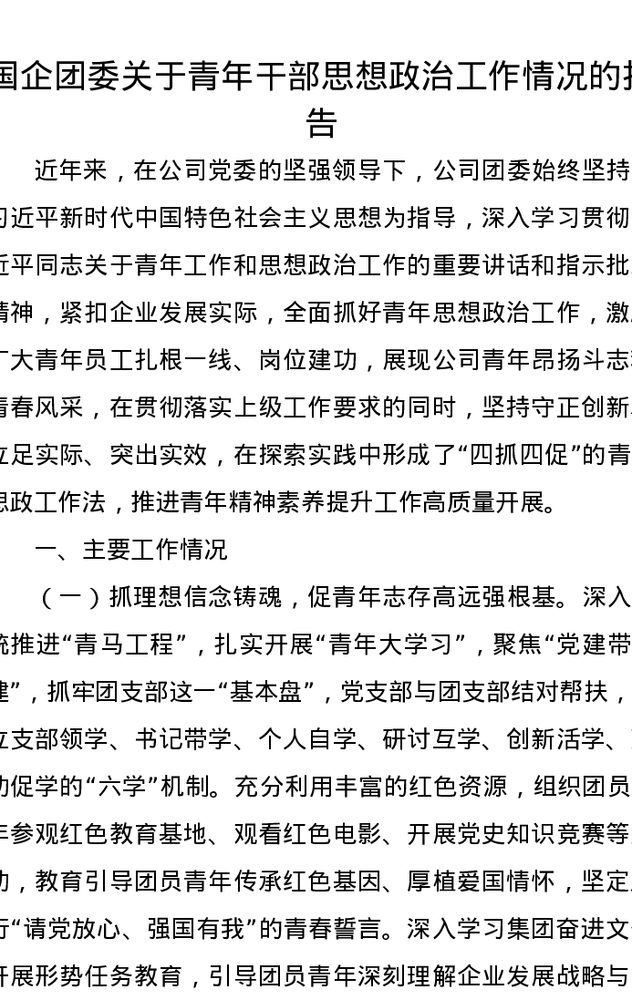 国企团委关于青年干部思想政治工作情况的报告