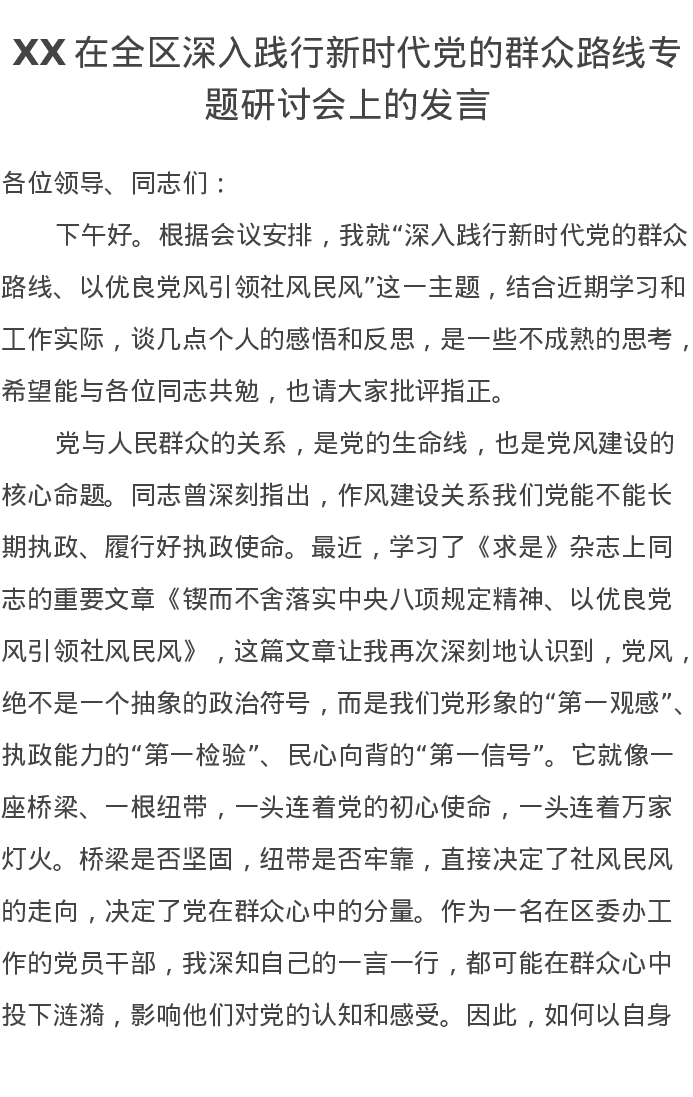 XX在全区深入践行新时代党的群众路线专题研讨会上的发言