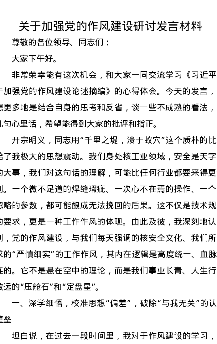 关于加强党的作风建设研讨发言材料(学习心得体会)