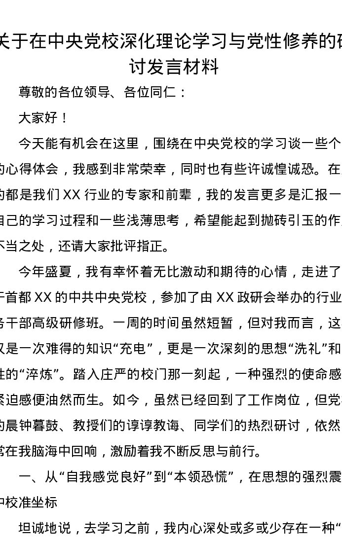 关于在中央党校深化理论学习与党性修养的研讨发言材料
