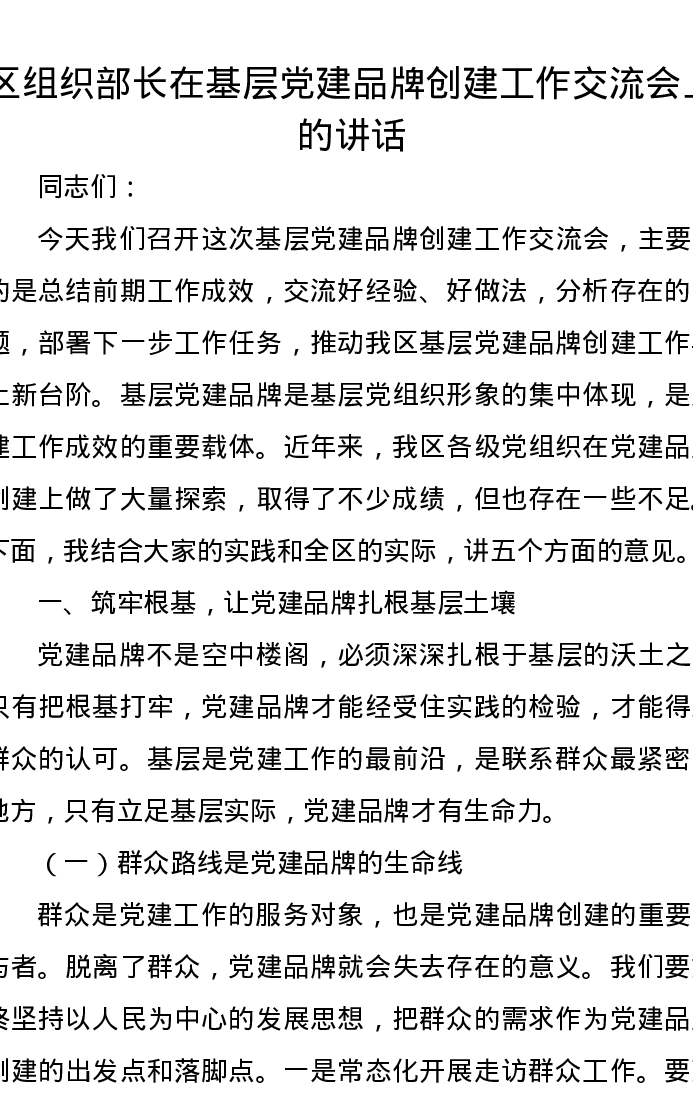 区组织部长在基层党建品牌创建工作交流会上的讲话
