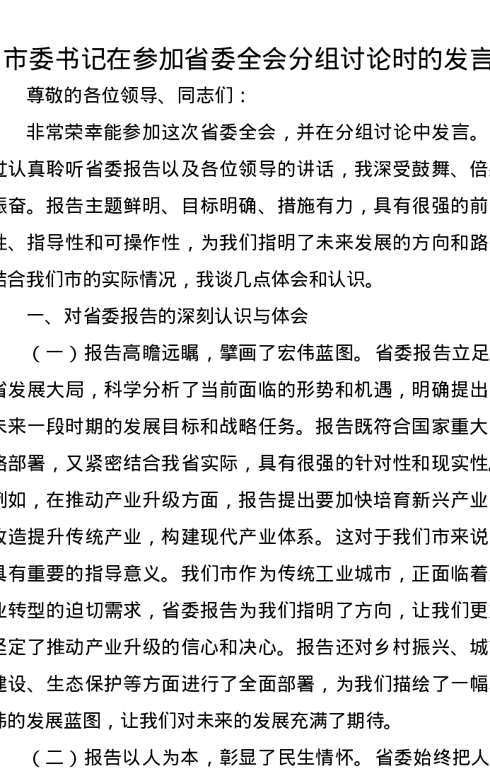 市委书记在参加省委全会分组讨论时的发言