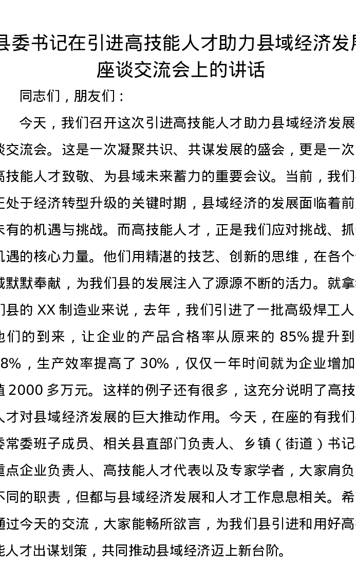 县委书记在引进高技能人才助力县域经济发展座谈交流会上的讲话