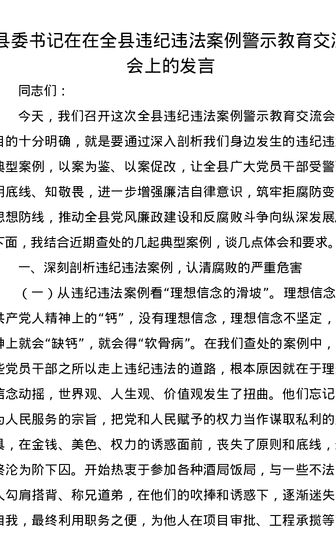 县委书记在在全县违纪违法案例警示教育交流会上的发言