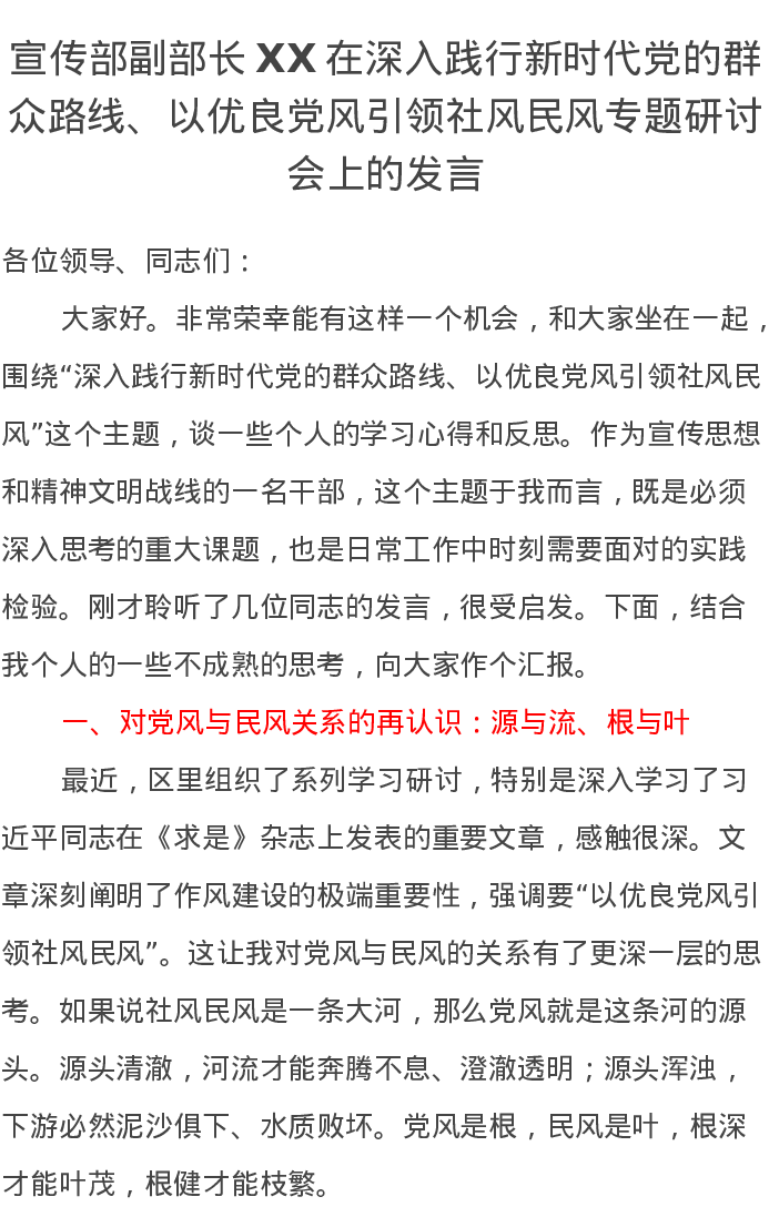 宣传部副部长XX在深入践行新时代党的群众路线、以优良党风引领社风民风专题研讨会上的发言