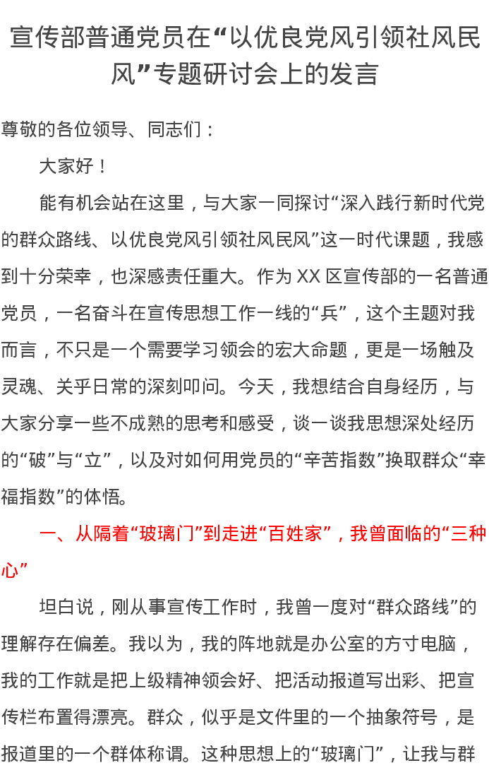 宣传部普通党员在“以优良党风引领社风民风”专题研讨会上的发言