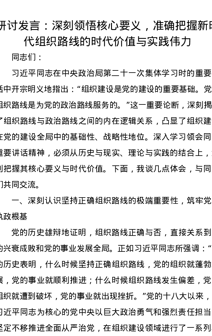 研讨发言:深刻领悟核心要义,准确把握新时代组织路线的时代价值与实践伟力