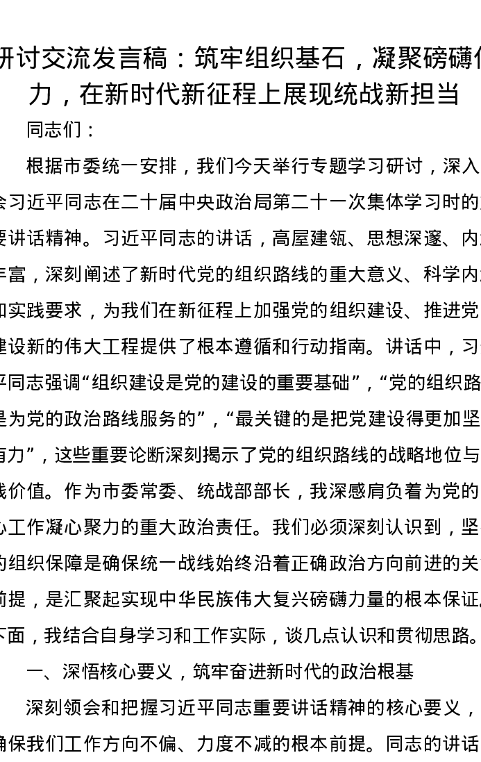 研讨交流发言稿:筑牢组织基石,凝聚磅礴伟力,在新时代新征程上展现统战新担当