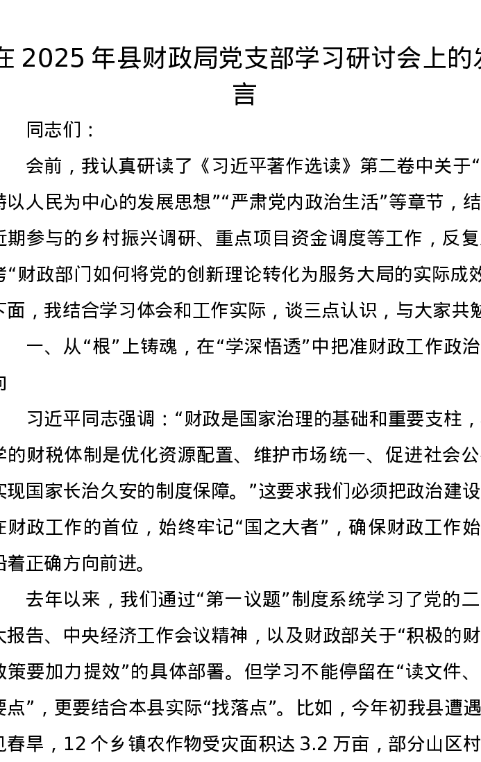 在2025年县财政局党支部学习研讨会上的发言