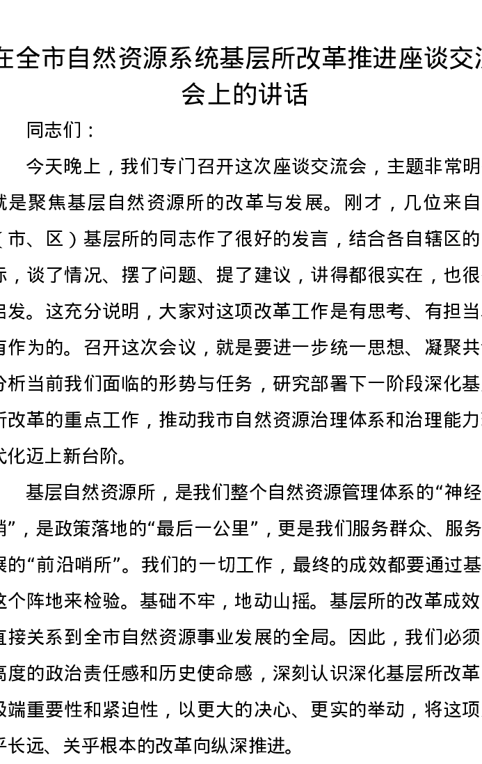 在全市自然资源系统基层所改革推进座谈交流会上的讲话