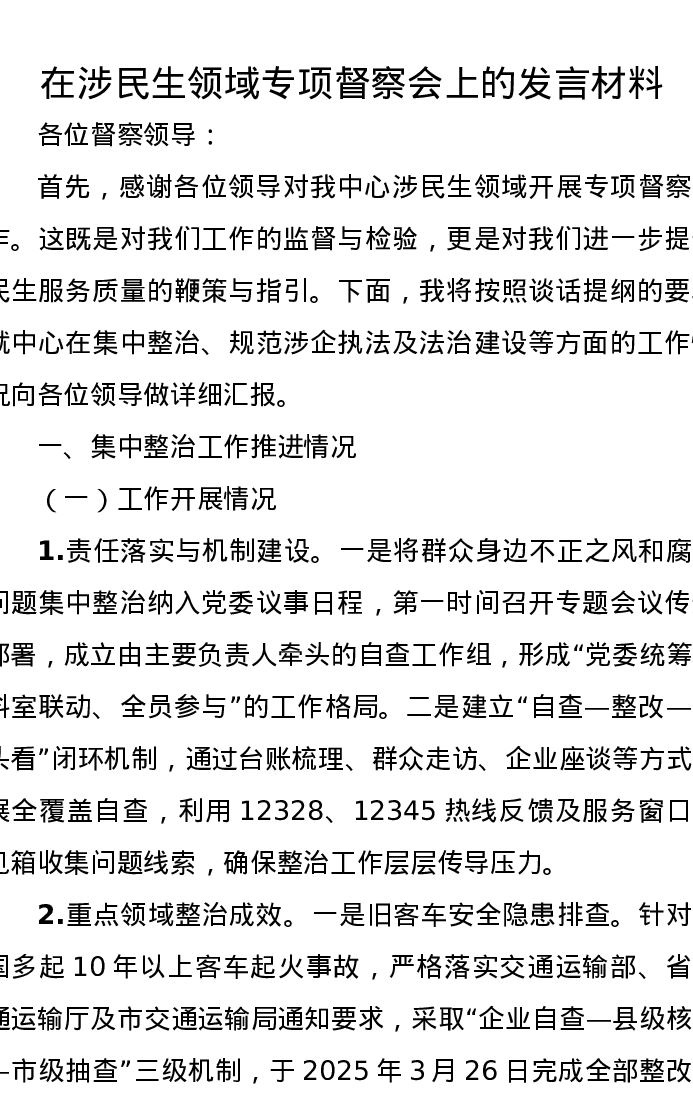 在涉民生领域专项督察会上的发言材料