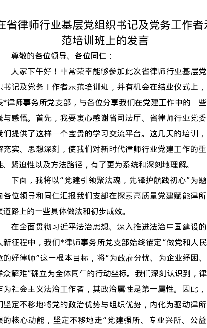 在省律师行业基层党组织书记及党务工作者示范培训班上的发言