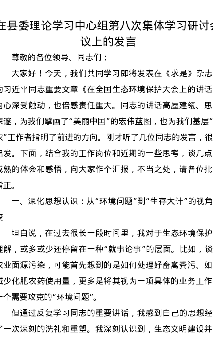 在县委理论学习中心组第八次集体学习研讨会议上的发言