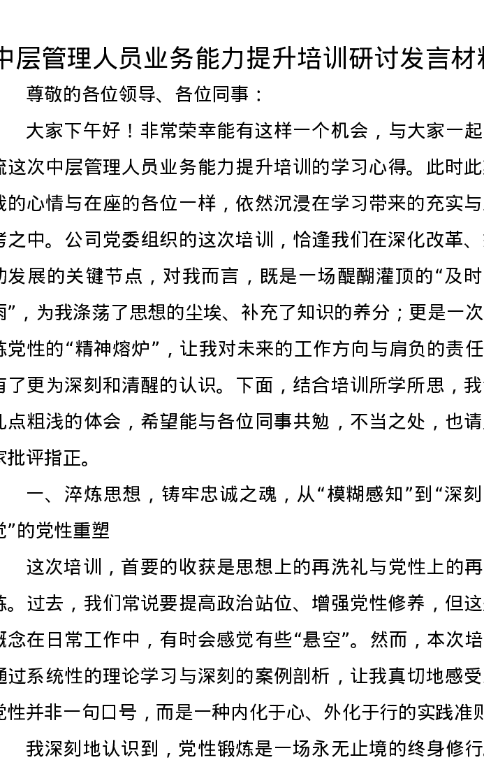 中层管理人员业务能力提升培训研讨发言材料