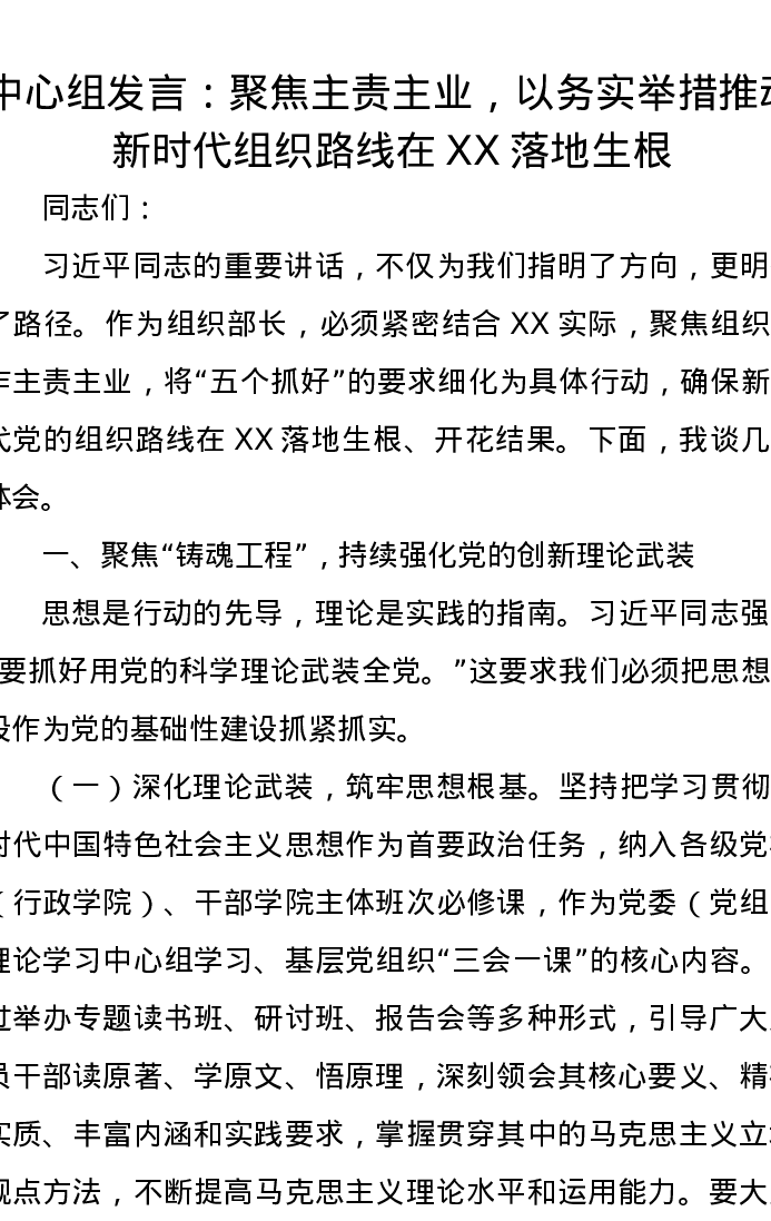 中心组发言:聚焦主责主业,以务实举措推动新时代组织路线在XX落地生根