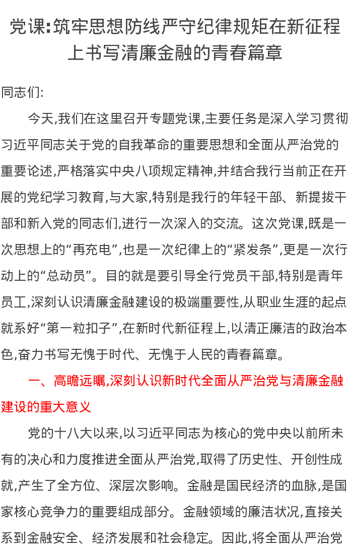 党课讲稿:筑牢思想防线严守纪律规矩在新征程上书写清廉金融的青春篇章