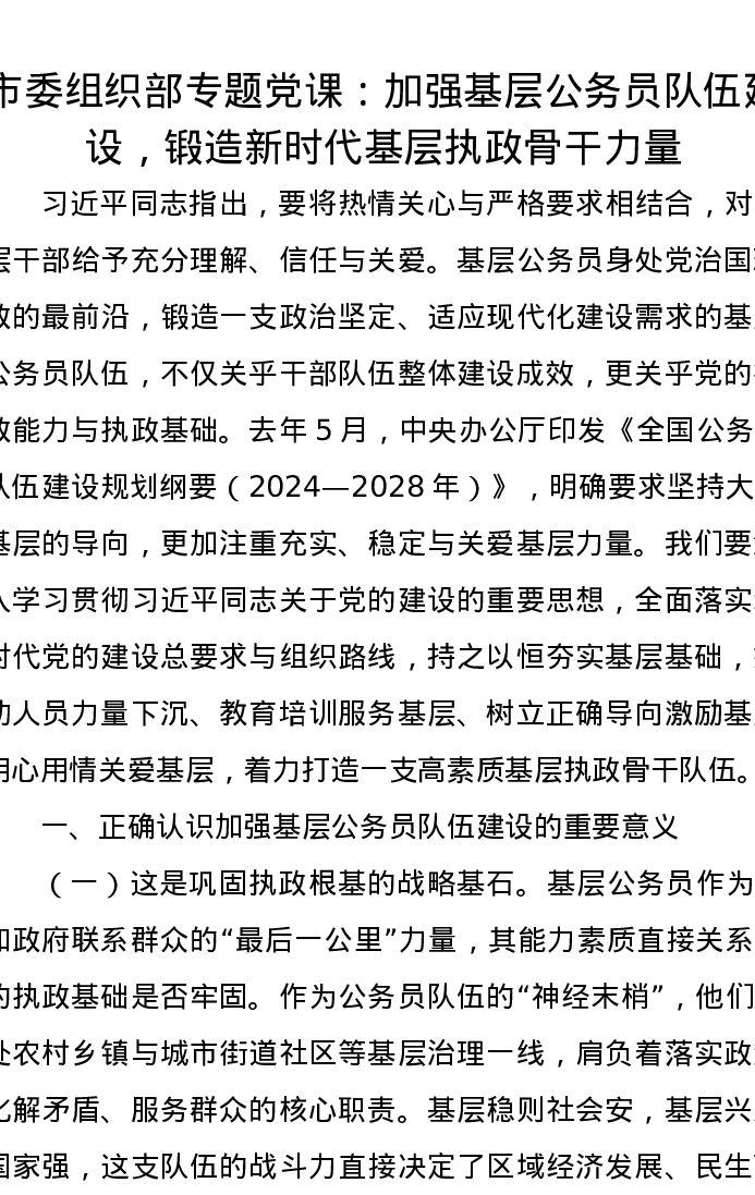 市委组织部专题党课:加强基层公务员队伍建设,锻造新时代基层执政骨干力量