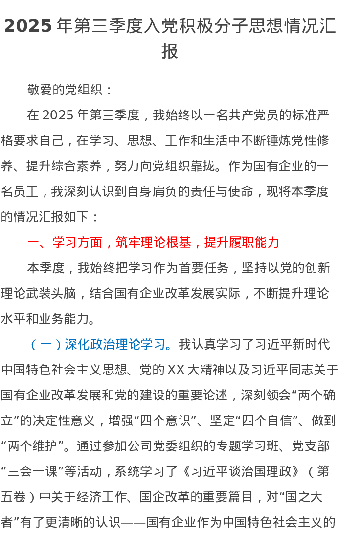 2025年第三季度入党积极分子思想情况汇报2