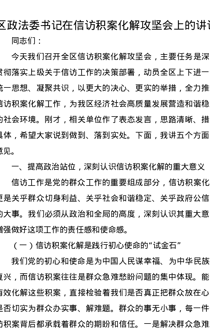 区政法委书记在信访积案化解攻坚会上的讲话
